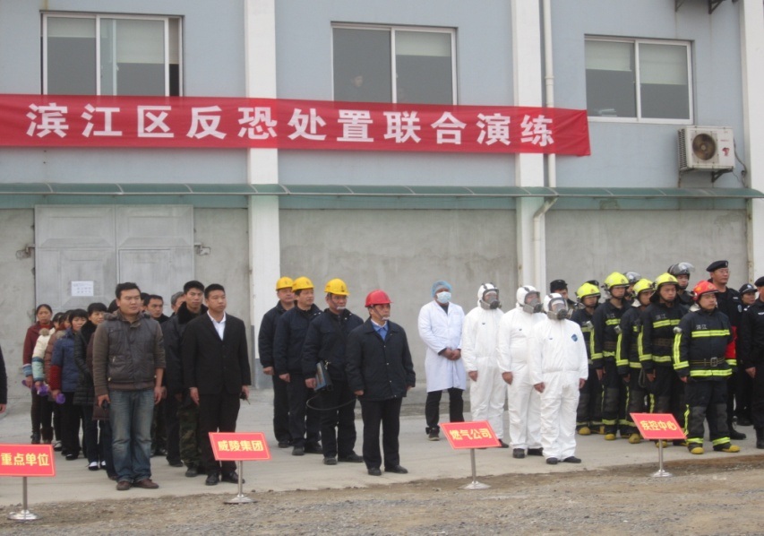 2013年12月20日下午,在杭天濱江分公司、區反恐辦的精心組織下,在海威大廈舉行了濱江區反恐處置聯合演練,分公司、區反恐辦、西興派出所、120急救中心、濱江消防大隊、區公安分局治安大隊、海威大廈物業百余人參加了此次演練。區委副書記俞少平等領導出席演習現場,區委、區政府屬各局、委、辦及區反恐聯動成員單位派員觀摩了此次演練。